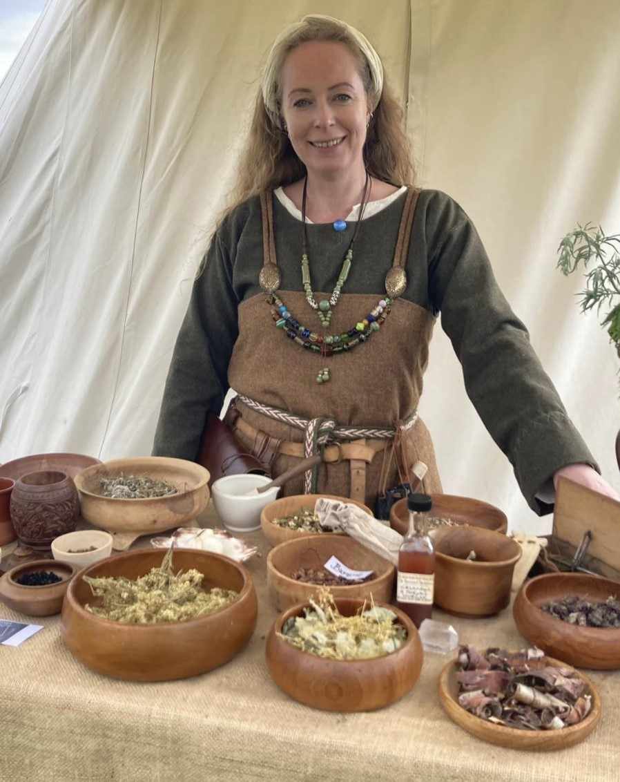 Our Viking age apothecary is run in collaboration with The Historical Herbalists, the educational outreach project of Movement in Thyme CIC (MiT), a grass-roots organisation that connects herbal medicines with diverse communities through interactive events and workshops throughout central Scotland. Their Community Learning Apothecaries and Community Herb Gardens aim to bring this knowledge back to where it belongs, into the hands of the people. MiT is passionate about teaching sustainable practices that supports not only people but also the planet – sustainable wildcrafting, bioregional herbalism and planting our own herb gardens to improve biodiversity, reduce miles and reduce the devastating effects of overharvesting The Historical Herbalists offer hands-on living history educational workshops and events. Rox, an experienced forager and community herbalist, and Jaye, a herbalist and ethnoarchaeologist, offer interactive educational experiences with their fascinating and immersive herbal medicine apothecaries through the ages, from the Romano-British era to the modern age.